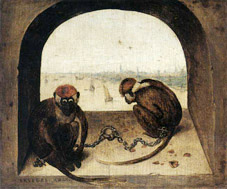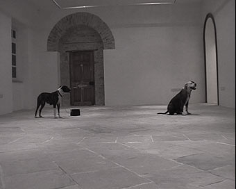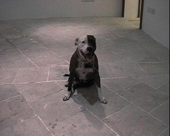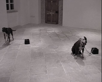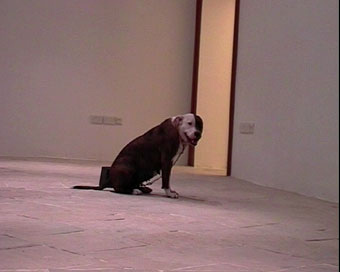 Political Twins : Inside the exhibition space, two dogs stand symmetrically to the center. Presented at : International Workshop for European Artists-Culture 2000, August 2002, Larnaca, Cyprus.